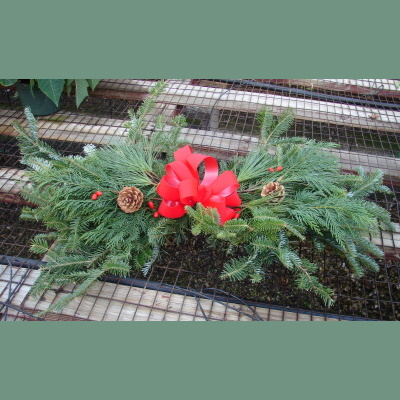 Decorated window swag with cones, berries, and red bow