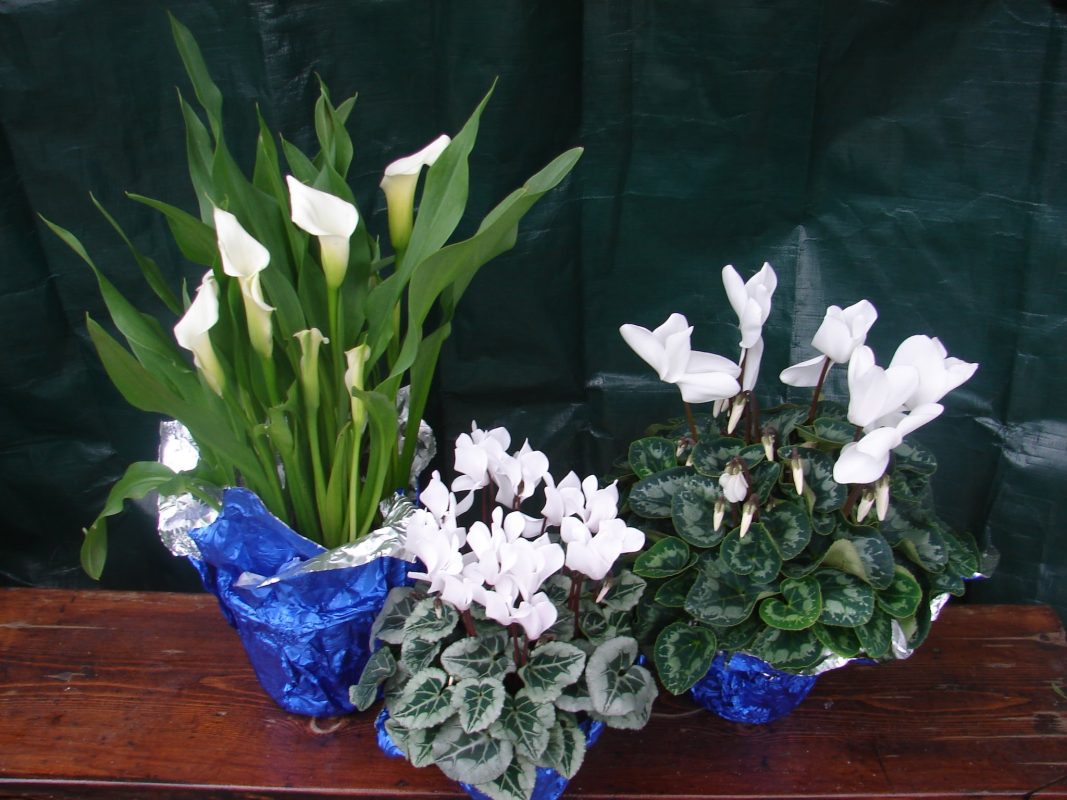 Tired of red poinsettias? Try the white, pink, or bicolored poinsettias or try something different like cyclamen. We also offer greens, garlands, and hand decorated wreaths with beautiful velvet bows. Need a gift? We design baskets and planters for decorating or gift giving.