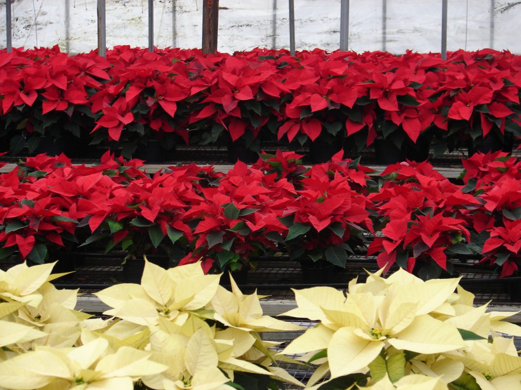 Poinsettias are the traditional Christmas flower, and we grow thousands of them: small 4” pots with a single bloom, the favorite 6” pots with 4-7 blooms, 7” pots of two plants with 10-12 flowers, and the large 8” pots of three plants with 12-18 blooms.