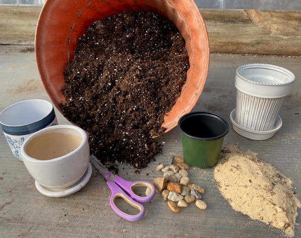 Gather: Potting Soil not yard dirt that might be contaminated, larger pot, material to cover drainage holes such as gravel or old window screen, scissors / knife to trim plant leaves or roots, sand for plants that want more drainage such as succulents, and a working surface.