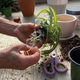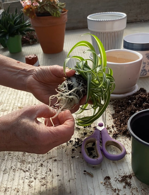 Massage large roots to remove some old soil, do not disturb small fibrous roots such as begonia or African violets. Large or circling roots can be trimmed but generally not more than 20% of roots. Remove old leaves, trim top or divide as needed.